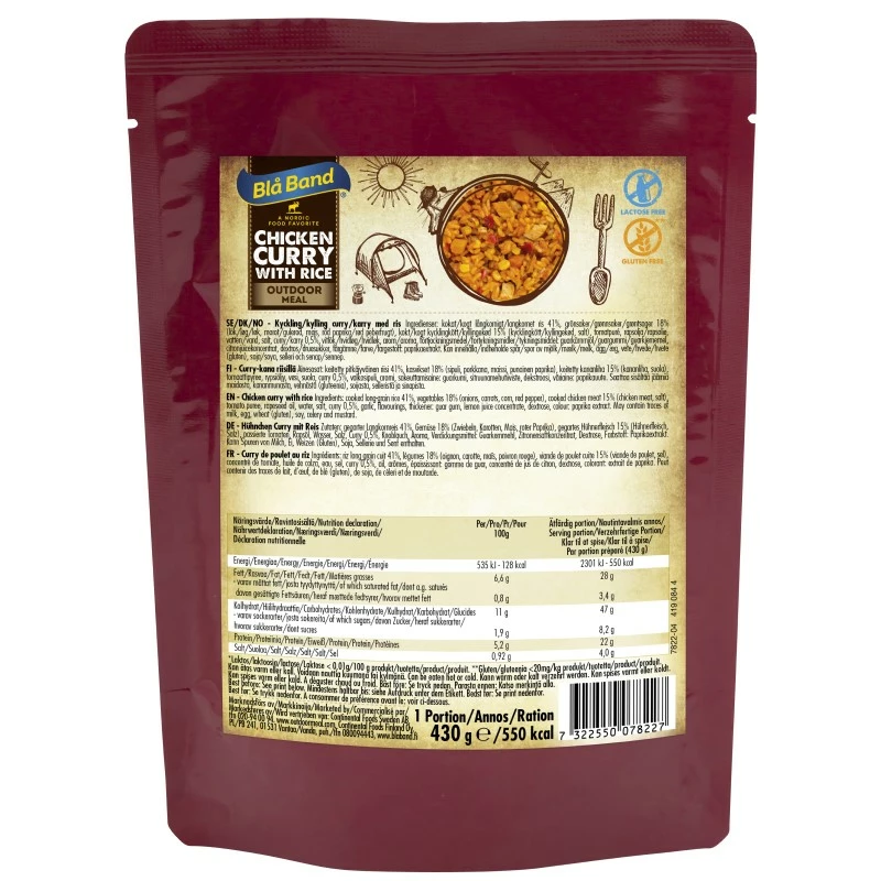 Ingrédients : Eau, légumes 18 % (oignons, carottes, maïs, poivron rouge), viande de poulet cuite 15 % (viande de poulet, sel), purée de tomates, riz long grain 10 % , huile de colza, sel iodé, curry 0,5%, ail, arômes, épaississant : gomme de guar, concentré de jus de citron, dextrose, colorant : extrait de paprika. Peut contenir des traces de lait, d’œuf, de blé, de soja, de céleri et de moutarde.Catégorie :Repas humide.Contenu :430 g.Durée de conservation : 36 mois à température ambiante en climat tempéré ou selon OTAN Norme AMedP-1.11 ; Chapitre 3 – Conservation. Stockage:Au sec à température ambiante.Valeurs nutritionnelles Pour 100g : • Énergie 535 kJ/128 kcal • Gras 6,6 g• Glucides 11 g • Fibre 1,3g • Protéine 5,2g • Sel 0,92g