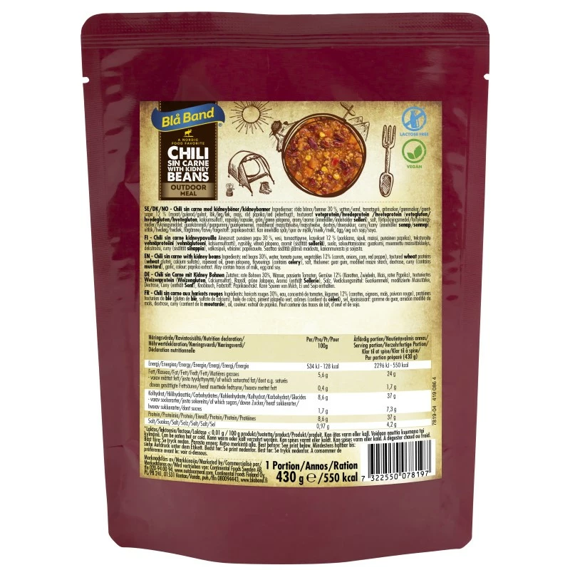 Ingrédients : Haricots rouges 30 %, eau, purée de tomates, légumes 12 % (carottes, oignons, maïs, poivron rouge), protéines de blé texturées (gluten de blé, sulfate de calcium, conservateur : sodium métabisulfite), huile de colza, jalape vertño, arômes (contient céleri et blé), sel iodé, épaississant : gomme de guar, amidon modifié de maïs, dextrose, curry (contient moutarde), ail, colorant : extrait de paprika. Peut contenir des traces de lait, d’œuf et de soja.Catégorie :Repas humide.Contenu :430 g.Durée de conservation : 36 mois à température ambiante dans un climat tempéré ou selon la norme OTAN AMedP-1.11 ; Chapitre 3 – Conservation. Stockage:Au sec à température ambiante.Valeurs nutritionnelles Pour 100g : • Énergie 534 kJ/128 kcal • Matière grasse 5,6 g • Glucides 8,6 g • Fibre 4,2g • Protéine 8,6 g • Sel 0,97 g